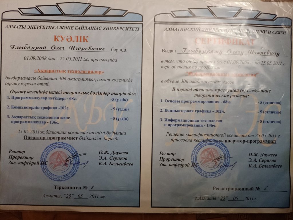 С 7-го класса учеников нашей МПГ распределили по классам, соответствующим нашим направлениям обучения и прикрепили за соответствующими университетами. В дополнительно выделенное время для обучения в АУЭиС (Алматинской Университете Энергетики и Связи) в течении 3-х лет на курсах и самостоятельного обучения на дому навыкам программирования получил специальность Оператор-программист.